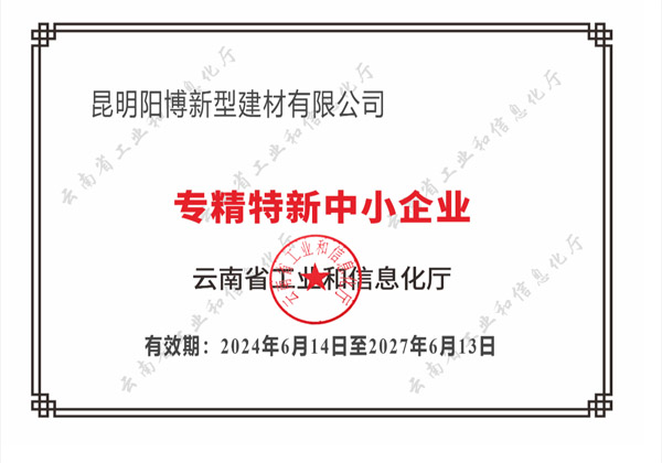 近期,云南省工業(yè)和信息化廳公布了2024年專精特新中小企業(yè)認(rèn)定名單,昆明陽(yáng)博新型建材有限公司成功入選。